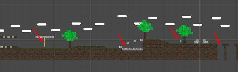 Algunos de los elementos están basados en mosaicos, como el suelo y los árboles, y el resto de los detalles son sprites de tamaño fijo: