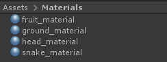 - Ahora, para los materials, crea 4 materiales (clic derecho -> Crear -> Material) y nómbralos respectivamente "ground_material", "snake_material", "head_material" y "fruit_material":