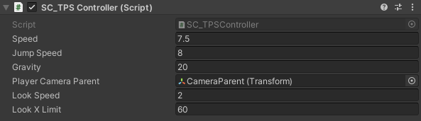 }- Adjunte el script SC_TPSController al objeto "Player" (notará que también agregó otro componente llamado Controlador de caracteres. Cambie su valor central a (0, 1, 0))