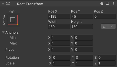 - Establezca los valores de "JoystickRight" Rect Transform igual que en la siguiente captura de pantalla: