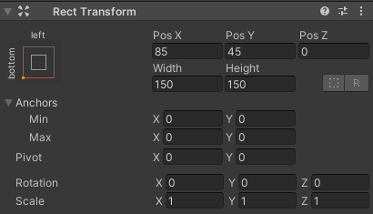 - Establezca los valores de "JoystickLeftButton" Rect Transform igual que en la siguiente captura de pantalla: