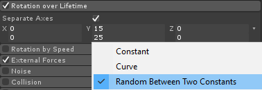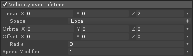 - En el sistema de partículas, habilite estos módulos: Emisión, Forma, Velocidad durante toda la vida, Color durante toda la vida, Tamaño durante toda la vida , Rotación durante la vida útil, Fuerzas externas, Renderizador.