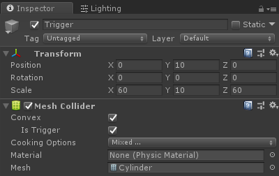 - Agregue el componente MeshCollider a "Trigger" GameObject, marque las casillas de verificación Convex y IsTrigger y cambie su malla al cilindro predeterminado.